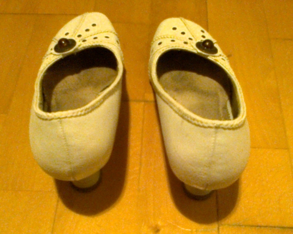 Női magassarkú cipellő. Fehér alapon barna, kerek dísz. Alig hasznűlt állapotban.